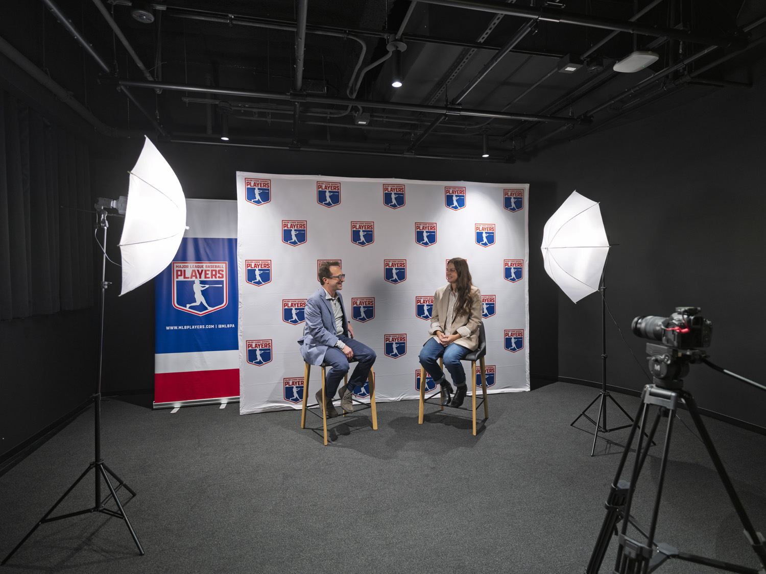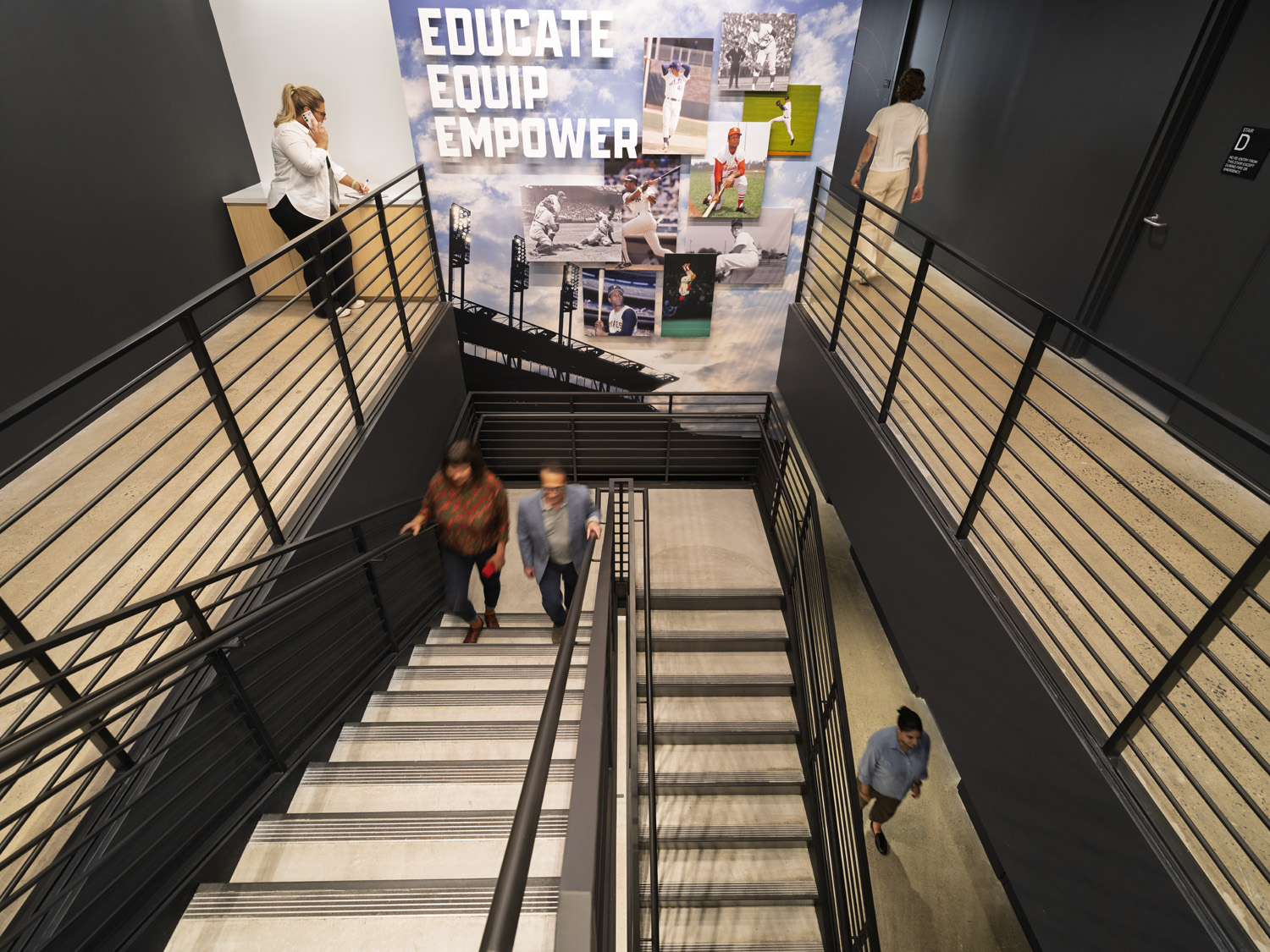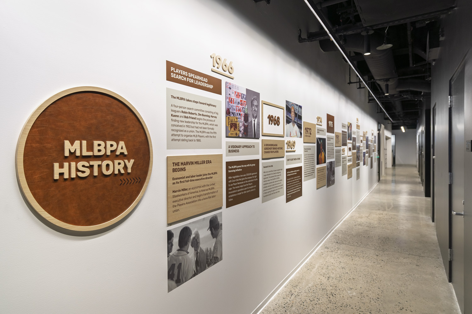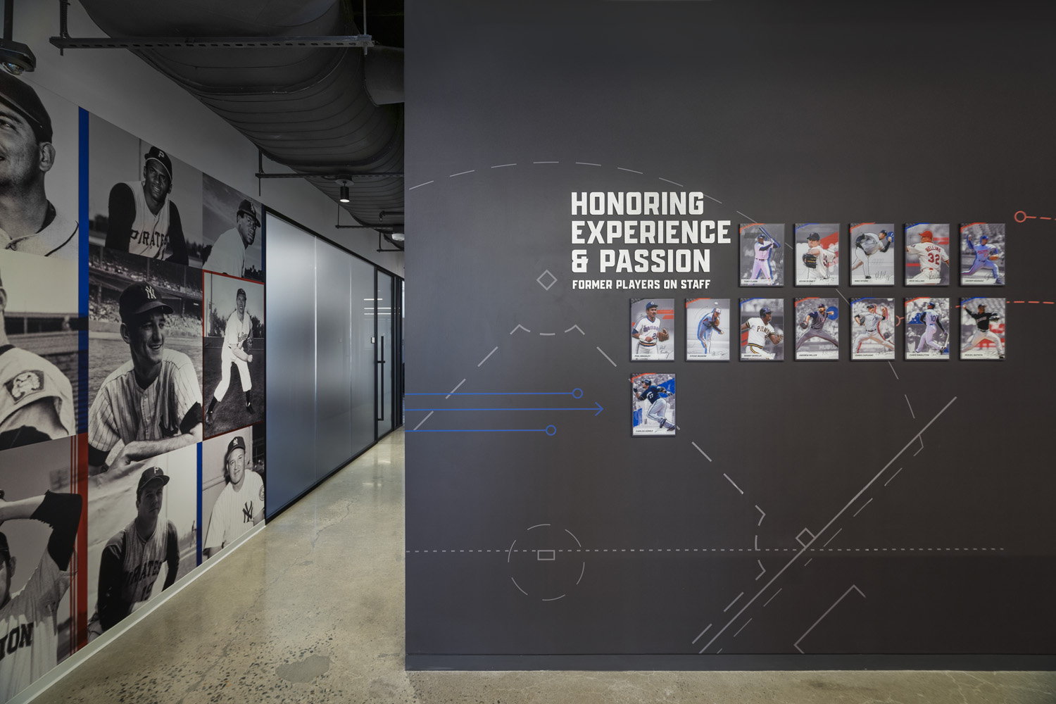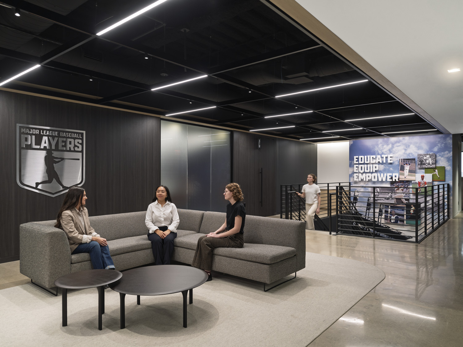The lower floor serves as a creative hub, encouraging collaboration among MLBPA’s in-house teams. Above, executive and legal spaces are grounded in legacy, featuring visual timelines, engraved player names, and materials that honor the evolution of the union and the sport itself. Branding is expressed through graphics, player photography, stadium-inspired signage, and baseball motifs that bring the story of the sport into the workplace. Material textures, custom glass films, and dimensional installations translate the grit, rhythm, and history of the game into physical space. Together, these player-focused moments reinforce connection across generations, creating a cohesive environment that honors MLBPA’s past while supporting its future.